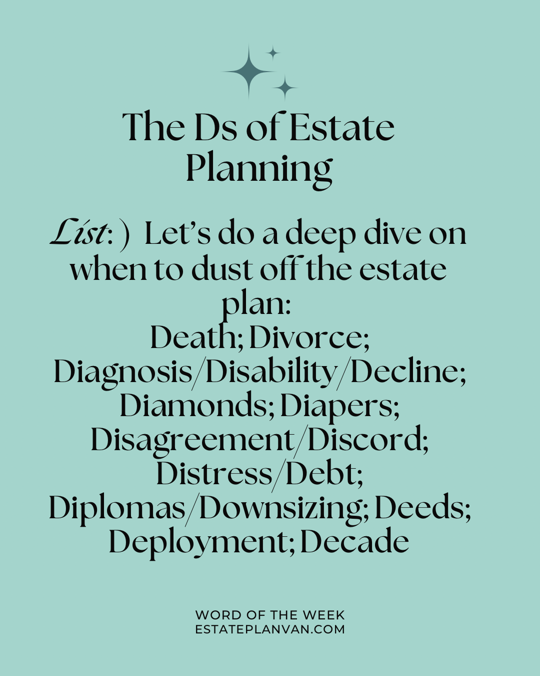 People often ask when they should update their estate plan. Here are some Ds to remember, but if you can only remember one, remember the last - decade. Dust off your estate plan not more than every 10 years. #✌️❤️⚖️ #estateplanvan #wheretheresawill